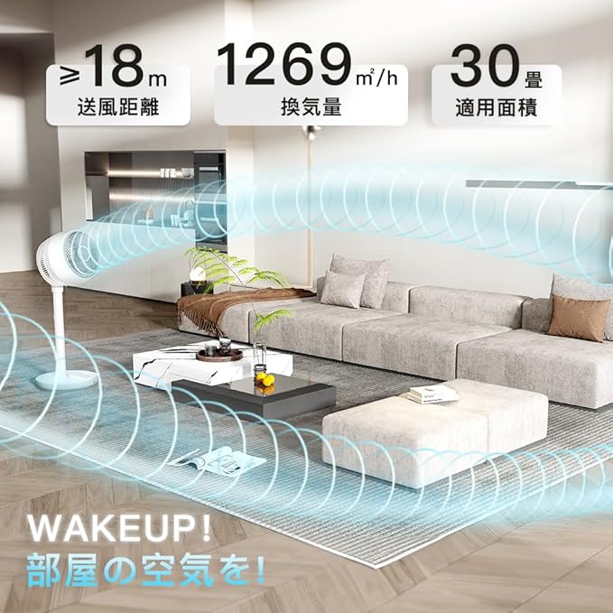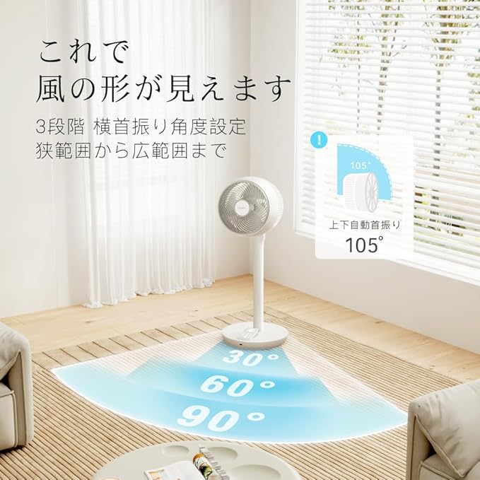 【自動首振り】左右首振り(30 /60 / 90 )と上下首振り(105 )を組み合わせ、上下左右同時首振りも可能です。お部屋の広範囲に3Dランダム送風して効率よく空気の循環ができるよう促します。3段階の左右首振りなのでシーンに合わせて心地よい風を送ります。360度首振りを通して除湿機、加湿器、エアコン冷房、暖房との併用でそれぞれの効果がアップ!