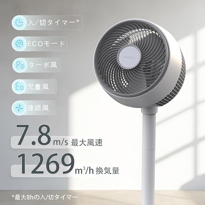 【静音&省エネ】従来のサーキュレーター&リビング扇風機の音デシベルは約35-60 dBで、XVOOXサーキュレーターの最小動作音は約20dBという限りなく小さい運転音に抑えられています。高性能のDCモーターを採用して立体形な羽根を搭載して空気を細かく切って抵抗力を大幅に低減して驚くほど静音性の同時に優しく心地よい風を提供します。風量段階によって消費電力は(約)3-35Wになり、全ての機能を全開しても1時間の電気代僅か(約)0.9円になり、節電にもつながってコスパの高さには舌を巻くほど。