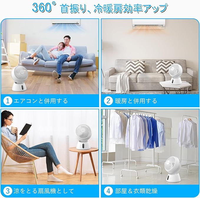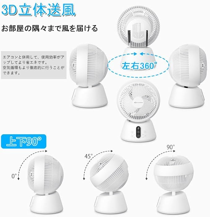 【パワフル送風&左右360 首振り】2024年最新版--小型ながら風量がパワフルなサーキュレーターです!!直進性送風、風を直線に集中させ、空気を一定の流れを作ることで攪拌し、より遠くところに届けます。左右の方向は0 →90 →360 の自動首振りの角度を選択でき、上下は90 の角度を調節できます。エアコンと併用して、使用効率がアップしてより省エネです。部屋の換気もより徹底的に行うことができます。