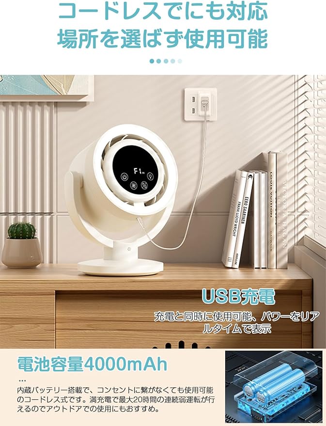 【充電式.搭載&コードレス使用可能】.内蔵で、コンセントに繋がなくても使用可能。フル充電の場合、低モードを使用している時間が20時間以上に到達します。便利なUSB充電式で、PCや電源アダプターにUSBケーブルを接続だけでどこでも充電できます。
