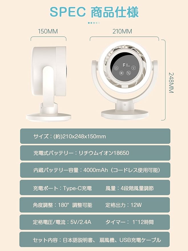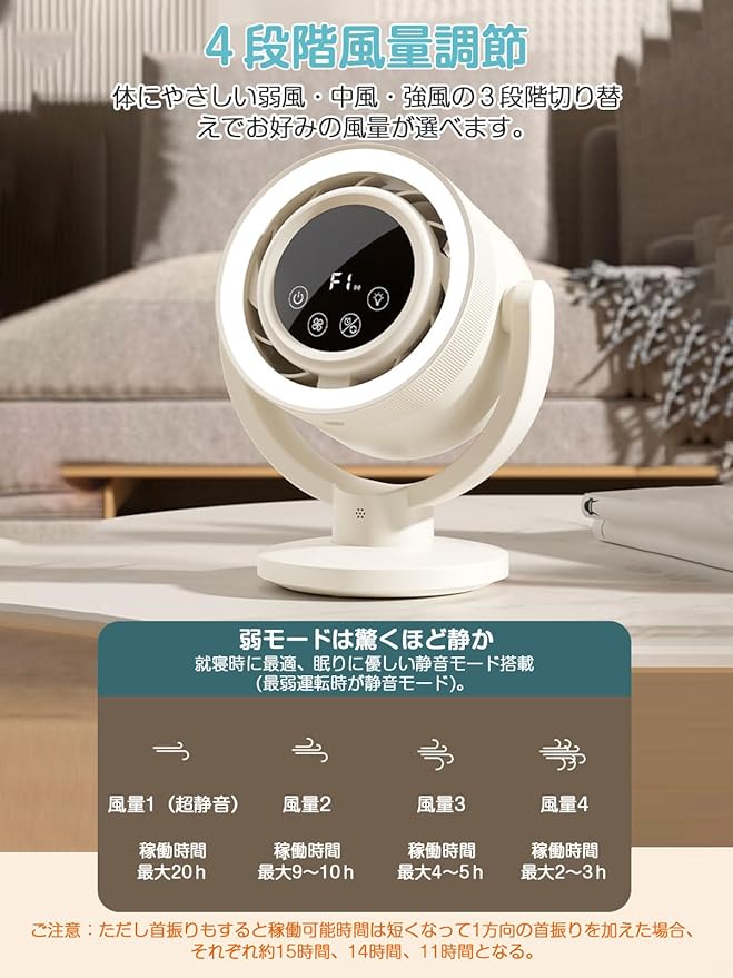 【自動首振り機能&4段階風量調節】自動首振り左右180 が可能で、広い範囲を涼しくしてくれます。手動で上下の風向きも調節が可能、全方向の送風ができます!風力は4段階で切り替え可能、使用時はお好みに合わせて自由に風量を調節できます。