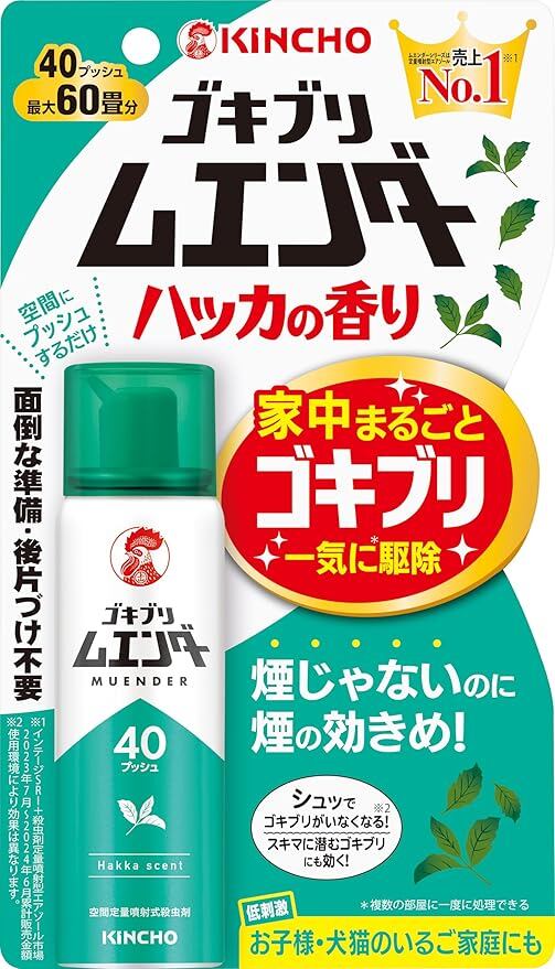 薬剤がスミズミまでいきわたり、隠れたゴキブリも追い出し、退治! 低刺激。お子様・犬猫のいるご家庭にも(噴射30分以降はお子様も入室できます)。