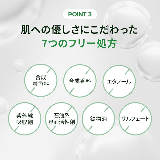 【7つの無添加処方】 合成着色料、香料、エタノール、鉱物油などを一切使用せず、敏感肌の方にも安心してご使用いただけます。