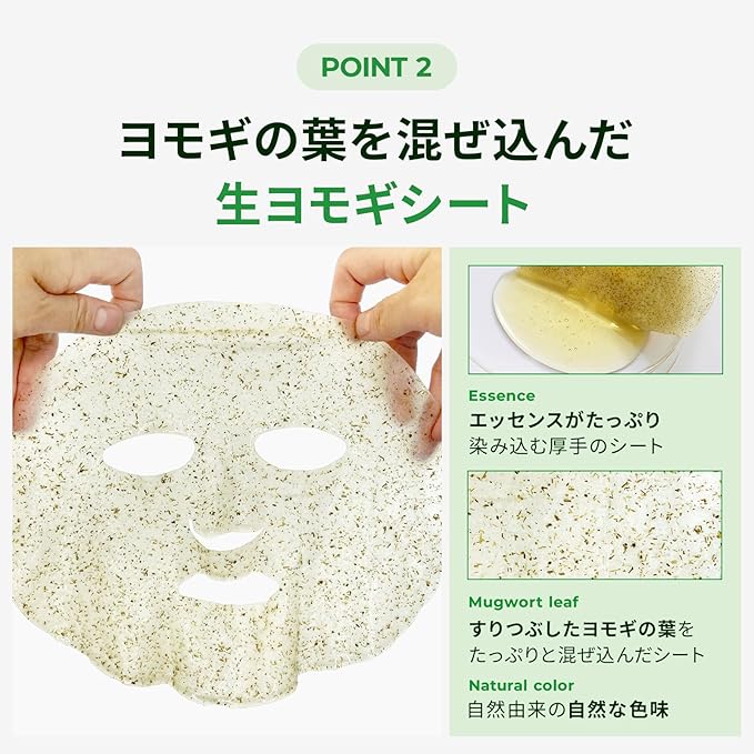 【オリジナルのヨモギシート】 すりつぶした生ヨモギの葉をたっぷりと混ぜ込んだシートで、肌を優しく包み込み、潤いと栄養を届けます。