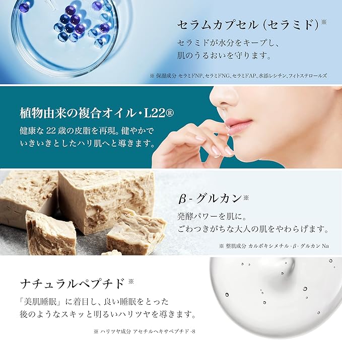 美容成分をぐんぐん届ける浸透型セラムカプセル、22歳の皮脂を再現したL22、ごわつき肌をやわらげる酵母β-グルカン、「美肌睡眠」に着目したナチュラルペプチドなどの厳選成分を使用。