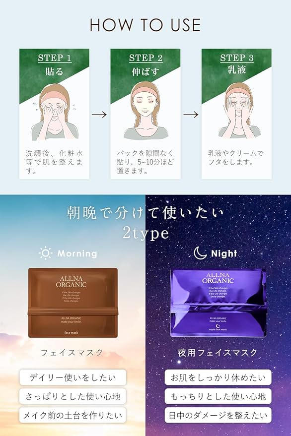 ✨【 朝用タイプ 】忙しい朝の時間...洗顔後のスキンケア「化粧水・美容液・乳液」が1枚で完了する オールインワンパック !高保湿なのにべたつかず、朝のメイク前にもピッタリです。