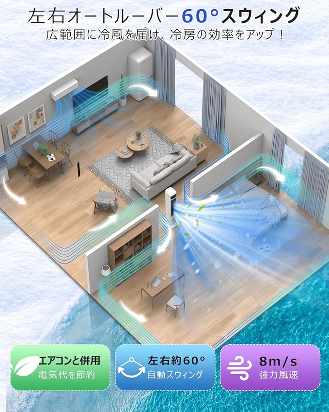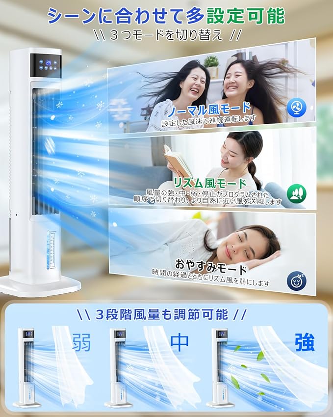 【広範囲に送風 頭から足元まで涼しい】 本2025新登場のスリムでスタイリッシュなタワーファンと冷風出す冷風扇の二つの機能が合体するタワー型冷風機は高さが92cmまであり、普通の冷風扇と比べてめっちゃ高くて、座る場合に全身に風が届き、涼しく快適に過ごします。さらに、自動首振り機能を搭載し、自動的に左右約60 に振ってくれ、お部屋全体に風を届けます。