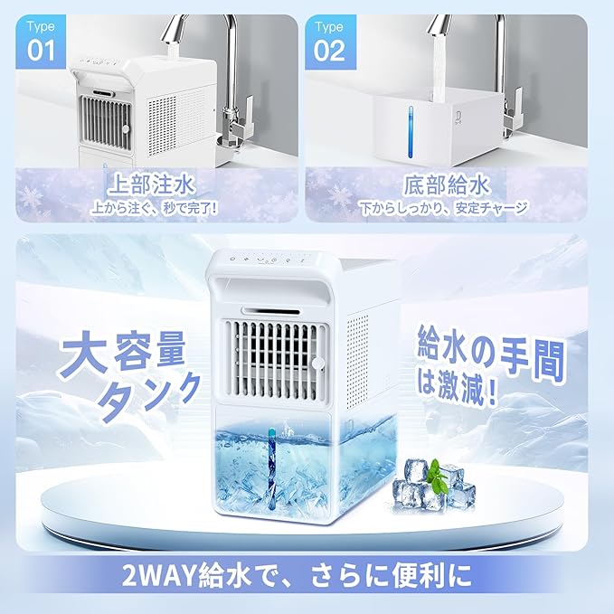 【軽量ボディ 提手付き|給水も持ち運びもストレスゼロ】わずか約1.9kgの軽量設計&持ち手付きボディで、女性や年配の方でも片手でラクに持ち運びOK。リビングから寝室、脱衣所、デスク周りまで、必要な場所に涼しさをそのまま運べる卓上冷風扇です。さらに、上下2WAY給水対応タンクを採用。上からコップでそのまま注ぐのはもちろん、引き出し式タンクをスライドして取り出し給水も可能。給水スタイルを選べるから、シーンに合わせて柔軟に対応できます。水漏れしにくいロック構造+広口設計でお手入れも簡単。機能だけでなく「使いやすさ」にまでこだわった、毎日使いたくなる冷風扇です。