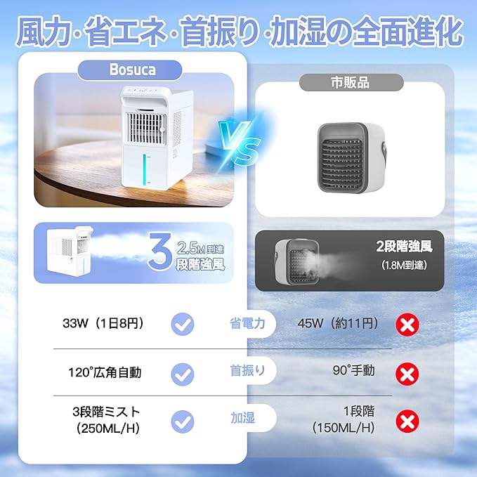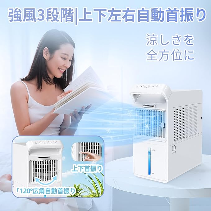 【氷霧・瞬で爆風冷却|小型でも“エアコンのような扇風機”】 当社独自開発のエアブーストターボ構造で、ミニサイズからは想像できない強力送風を実現。3段階の風量モードと左右最大120 の自動首振り機能で、お部屋全体をムラなく冷却します。 さらに本製品は、水タンク内の冷水を気化させ、微細な“冷感ミスト”を発生させる構造を搭載。肌にしっとりと届くひんやりミストが、扇風機では得られない「体感温度の即時ダウン」を叶えます。 まさに、「エアコンのような扇風機」。風だけでは物足りない夏の猛暑にも、直接涼しさを届けるミニクーラーとして活躍。しかも消費電力はわずか数十Wの省エネ設計で、エアコンより経済的&環境に優しい。