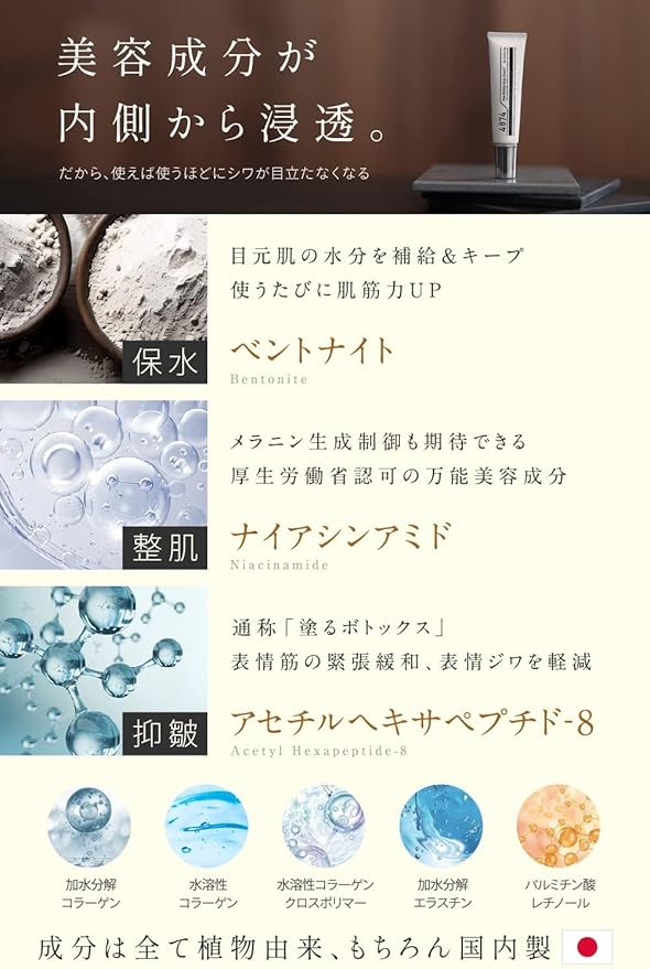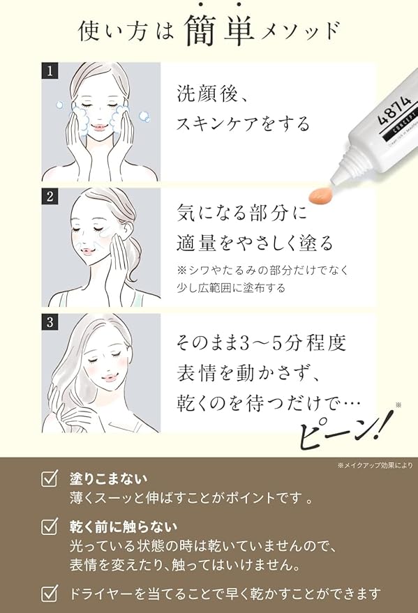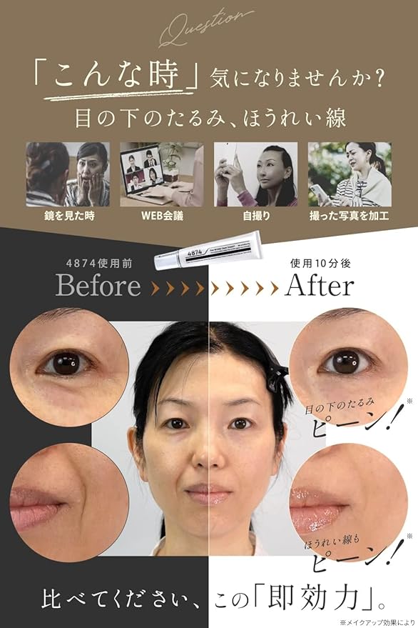 ◆目元のたるみやほうれい線は、顔の印象に大きく影響します。そんな悩みを隠しながらケアできる画期的な商品、『アイリペアクリーム「4874(シワナシ)」』をご紹介いたします。