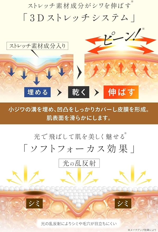 ◆塗って乾かすだけで、気になるたるみや小じわをカバーし、ハリのあるなめらかな印象に導き、最長約10時間持続させます。(皮膜効果により)