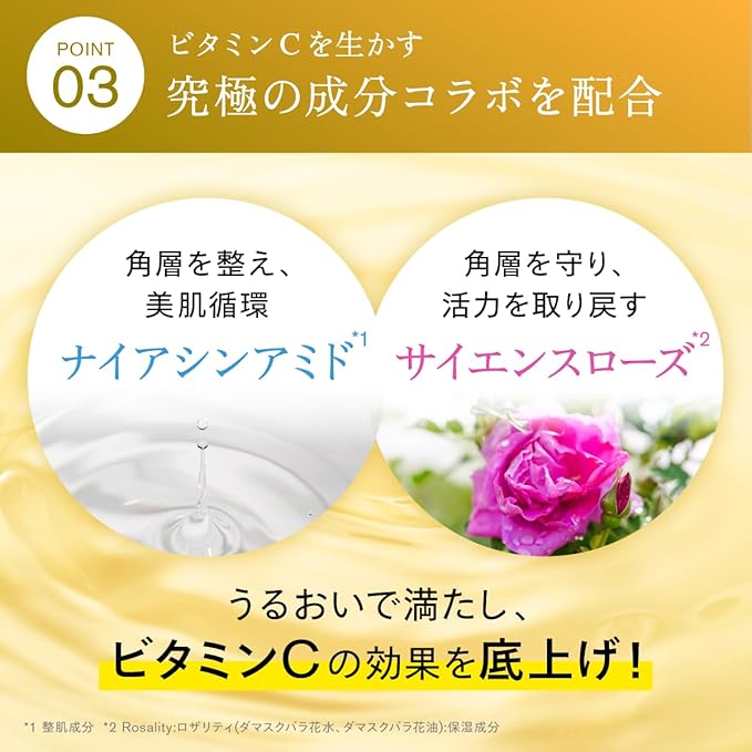 【ビタミンCを活かす究極のコラボ】エイジングケアの強い味方ナイアシンアミドと美容効果の高いローズエキスを贅沢に配合。ビタミンCの魅力を引き出しながら、敏感肌でも毎日使えるやさしいビタミンC美容液です。