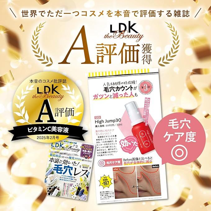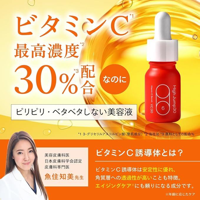 【毛穴悩みを超えていけ】ビタミンC誘導体30%配合の高濃度ビタミンC美容液。乾燥、毛穴、ハリ、くすみ、キメ、肌荒れの6大肌悩みを1本で解決するパワフルな高濃度ビタミンC美容液です。肌にツヤを与えうるおいと弾力をハイチャージ。