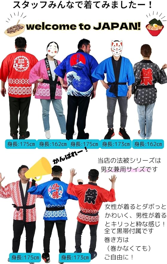 お祭り、学校行事、会社のイベント、ホームパーティー!!使い方は無限大☆彡羽織るだけで楽しい雰囲気になります!!是非、お揃いで着てみてくださいね。