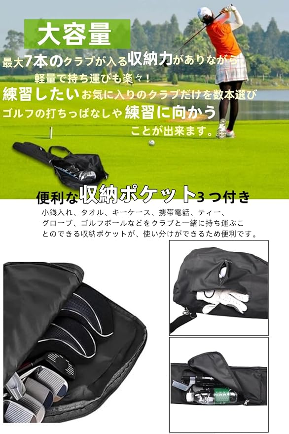 【大容量】最大7本のクラブが入る収納力がありながら、軽量で持ち運びも楽々!クラブケース自体軽いので、数本収納した場合でも、簡単に持ち運ぶことが可能です。