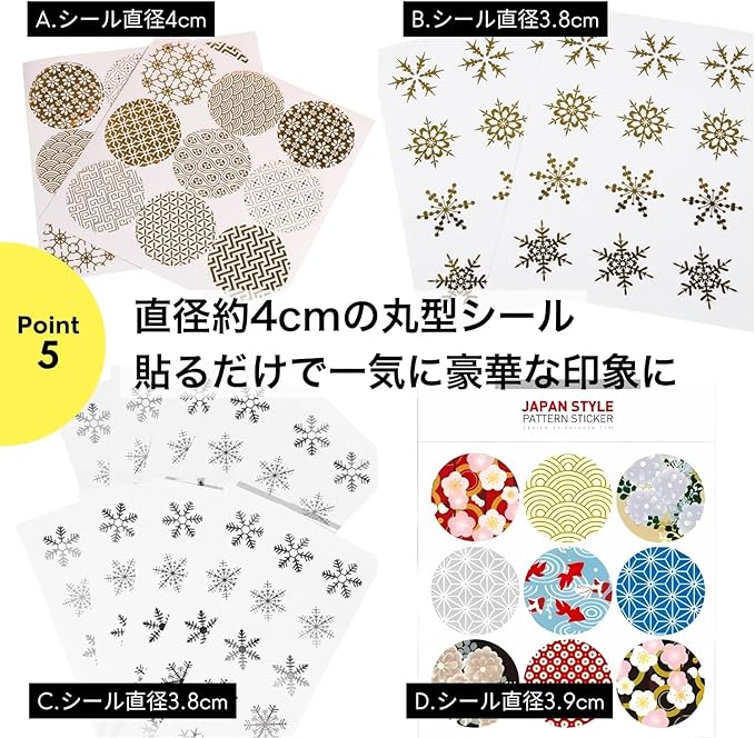 【バリエーション・セット内容】A. 和柄ゴールド(透明PVC素材)約4cm…1シート9枚、合計180枚入り、B. 雪の結晶ゴールド(透明PVC素材)約3.8cm…1シート12枚、合計240枚入り、C. 雪の結晶シルバー(透明PVC素材)約3.8cm…1シート12枚、合計240枚入り、D. 和柄カラフル(紙素材)約3.9cm…1シート9枚、合計180枚入り