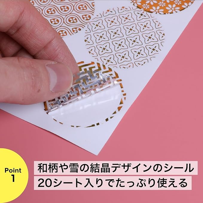 【たっぷり使える丸型シール】直径約3.8cmの丸型シール。おしゃれな和柄シールや、雪の結晶シールの20シートセットです。大容量でラッピングや装飾などさまざまな用途にたっぷり使えます。