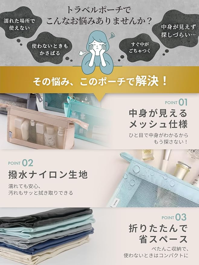 【折りたたんで省スペース】 使わないときはぺたんこに折りたためるコンパクト設計。バッグの隙間に収まり、軽量だから旅行やお出かけの持ち運びにも最適。毎日の持ち歩きにも便利な、折りたたみできるトラベルポーチは、家族みんなで共有できる使いやすさが魅力です。