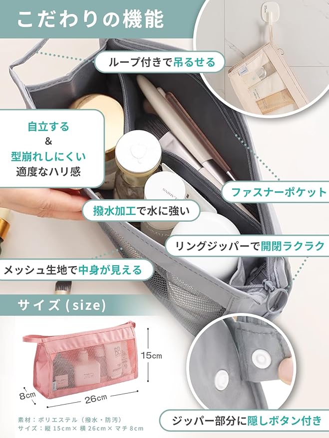 【中が見える安心感】 中が見えるメッシュ仕様で、ポーチの中身がひと目でわかるからストレスなし。自立するから化粧ポーチとしても使いやすく、洗面所やお風呂まわりにもぴったり。内部にはファスナーポケットもついていて、細かな小物の整理にも便利なメッシュポーチです。