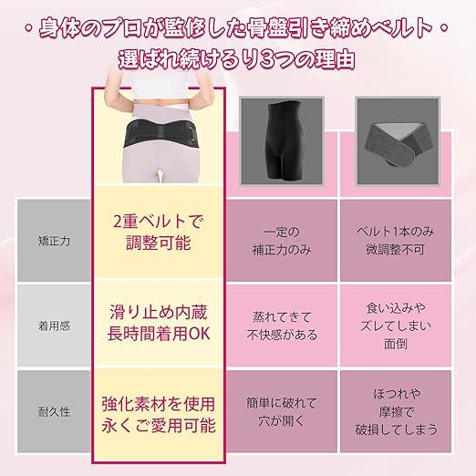 【二重構造&調節可能】ダブルベルトが付いた人気の仕様を採用。メインベルトと補助ベルトで骨盤をしっかりホールドします。左右の補助ベルトを軽 く引っ張るだけで、抜群の補整力。自分好みに調整できるので、フィット感も抜群です。日常生活や スポーツに最適な薄型・軽量設計。 ご年配の方や女性でも簡単にしっかりと骨盤を固定できます。