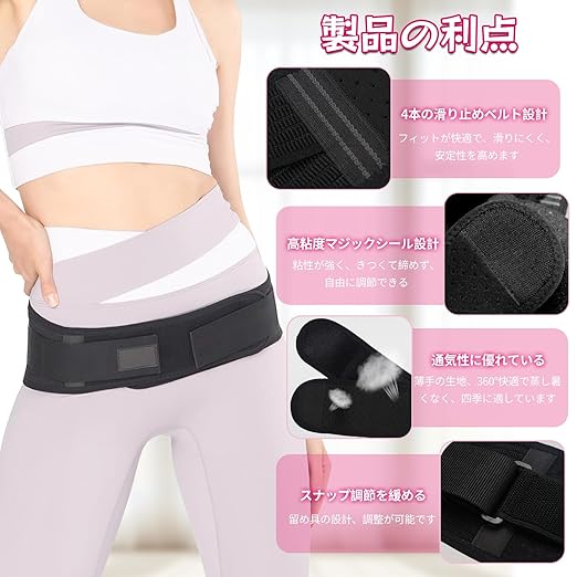 【安全・安定性】 .の骨盤ベルトは滑り止め効果が良好です。背面の滑り止めシリコンがベルトをしっかり固定し、様々な活動時に着用してもずれなく、持続的に加圧します。柔軟な素材と優れた伸縮性により、自然な動きを妨げることなく快適に姿勢をキープできます。