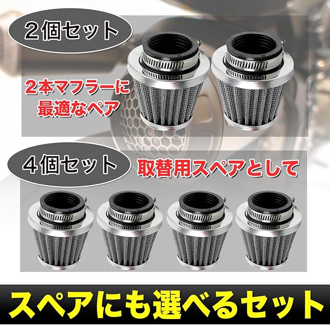【簡単取り付け】2個セットと4個セットを展開し、50mmのストレートデザインで、初心者でも簡単に取り付けが可能です。これにより、時間をかけずにバイクの性能を向上させることができます。手軽にカスタマイズを楽しみたい方に最適です。