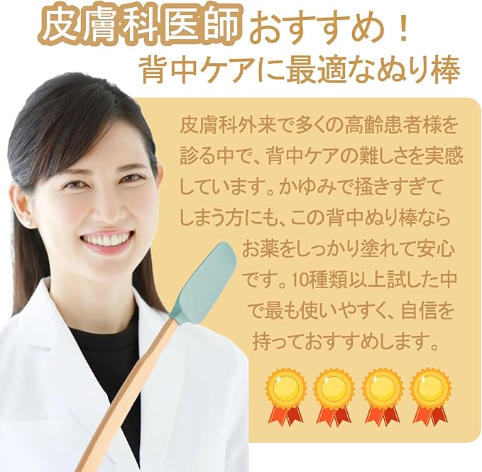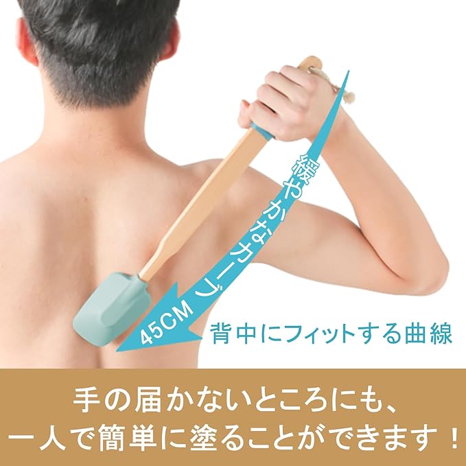 【塗りやすさ抜群】背中にクリーム塗り 棒は全長45cmで、手が届かない背中にも簡単に薬を塗ることができます。緩やかなカーブデザインで、使いやすく、柔らかい素材で肌を傷つけることなく、ローションやクリーム、軟膏を一人でも安心して背中に塗れる、皮膚科医も推薦する高品質な便利商品です。