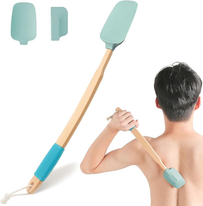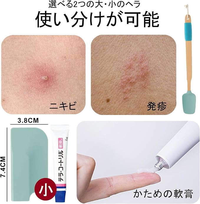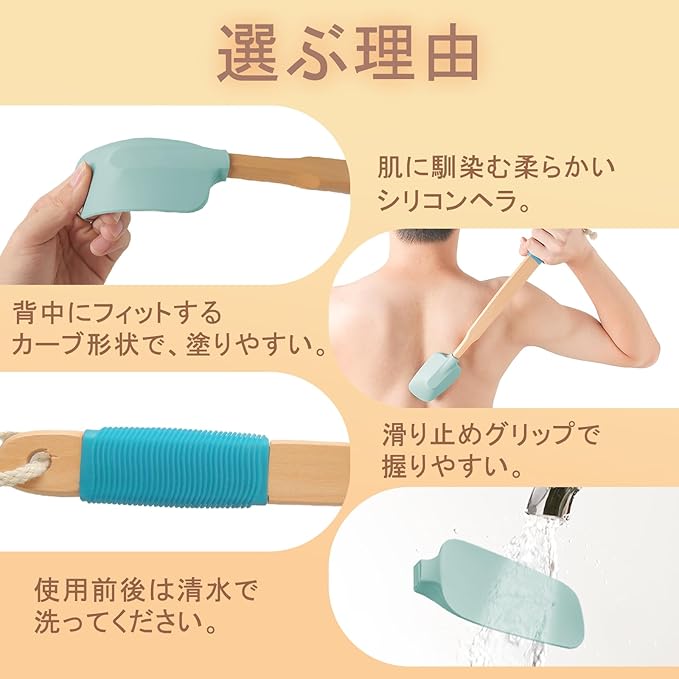 【大・小のヘラ付き】背中に塗る道具には、大小2種類のヘラが付属しています。大きいヘラは広範囲にローションや日焼け止めを塗るのに適しており、小さいヘラは背中のニキビや湿疹など、ピンポイントでのケアに最適です。用途に合わせて柔軟に使い分けることができます。
