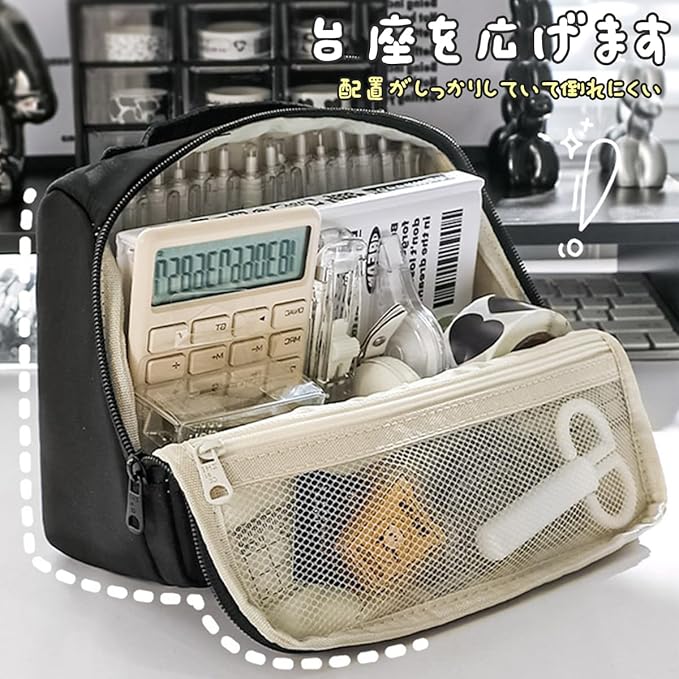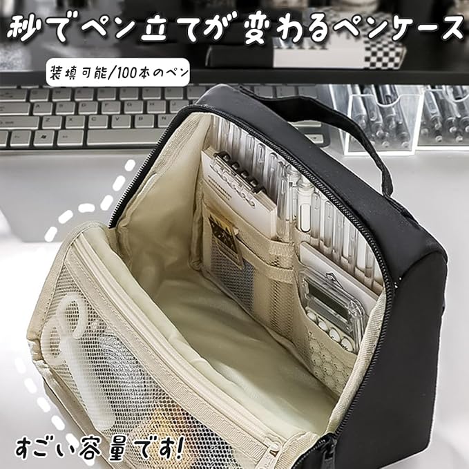 【大容量デザイン】ペン収容本数は100本程度で、文具や小物もたっぷり収容できます。※ペン類のサイズにより収容数が違っております。消しゴム、付箋、定規、丸ルール、修正テープなどの文房具を入れることができます。