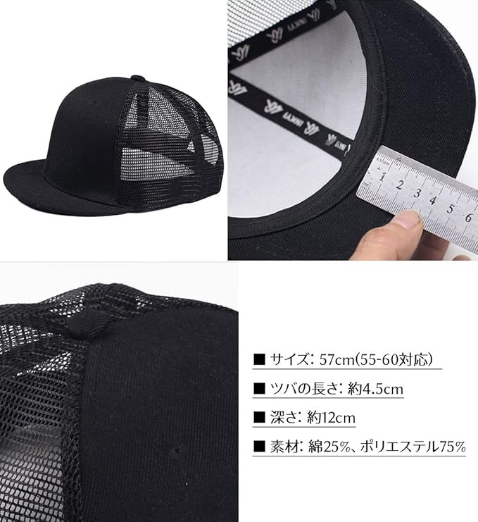 サイズ:57cm(55-60対応) ツバの長さ:約4.5cm 深さ:約12cm 素材:綿25%、ポリエステル75% ※中国製。記載のサイズは実寸と誤差があることもあります。ご了承ください。