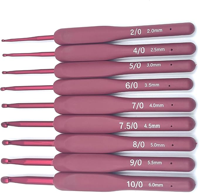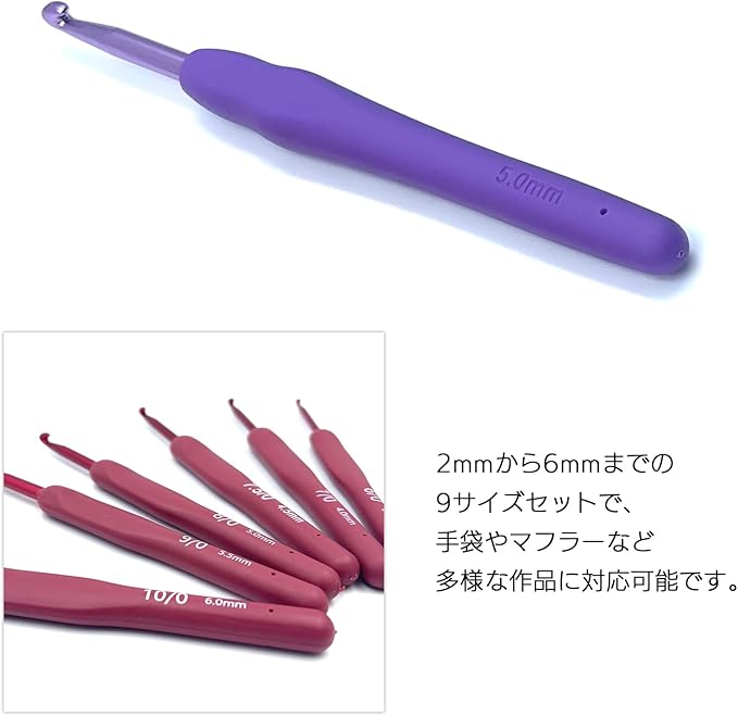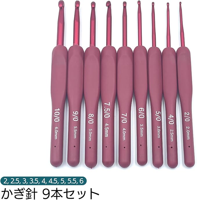 号数が小さいほど編み目が細かくなり、大きい号数ではふんわりとした編み上がりになります。本商品は2mmから6mmまでの9サイズ入りかぎ針セット(2, 2.5, 3, 3.5, 4, 4.5, 5, 5.5, 6)で、手袋やマフラー、花モチーフなど多様な作品作りに対応。細めのレース糸から厚手の毛糸まで、幅広い糸に対応できます。