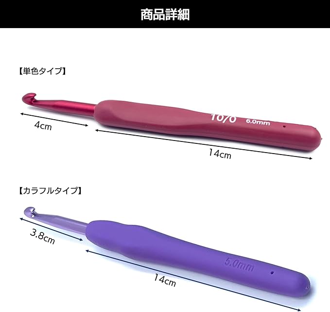各サイズごとに持ち手の色が異なっており、見分けがしやすく、作業効率もアップ。太めのグリップで力を入れずにスムーズな編み心地を実現しています。糸が引っかかりにくいため、初心者の方でもスイスイ編み進められるのも嬉しいポイントです。なお、お持ちの道具に合わせてかぎ針 10号などを追加購入する際にも、本セットとの併用が可能です。