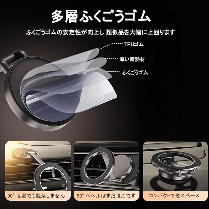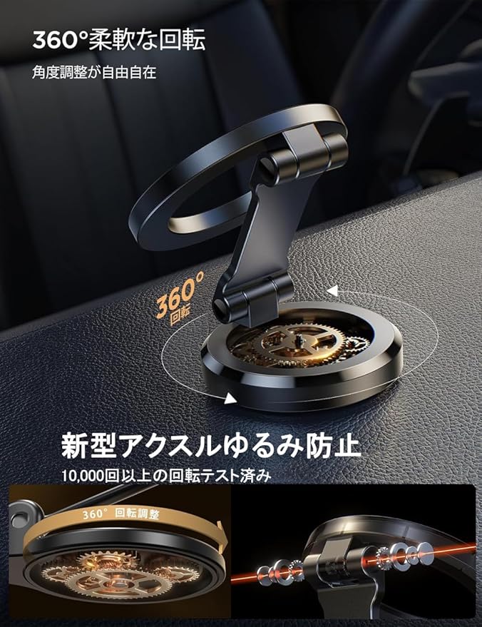 【超強力で瞬間吸着】本車用スマホホルダーは22個の55Nグレードの.を使用され、非常に強力であり、瞬間でスマホをしかっり吸着できます。更に、.互いのN極とS極が安定な閉路磁気回路となり電波干渉なし、スマートフォンの5G信号やGPS機能に影響ません。いつもフルシグナル、スムーズに通信できます。磁力を損なわず寿命10年以上。走行中の振動や急加速、急ブレーキなどの動きにも対応でき、ホルダーが突然外れてしまう心配がありません。マグネット式ホルダーで片手で操作ことが可能ので、快適にドライブをお楽しみいただけます。