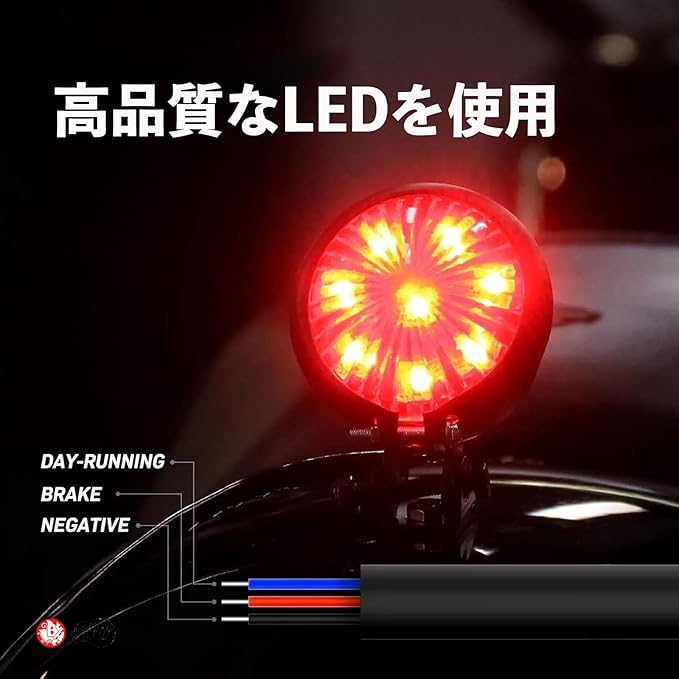 高品質なLEDを使用しており、振動や衝撃に強く、厳しいバイクライフにも耐えうる堅牢さを備えていルため、ブレーキランプとしてだけでなく、テールライト、ストップランプとしてもお使いいただけ、長期間安定してご使用いただけます。
