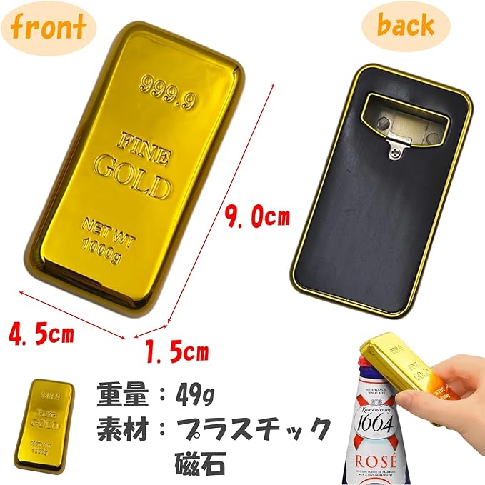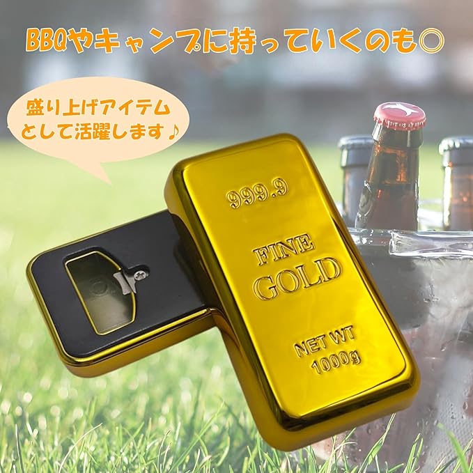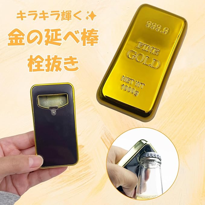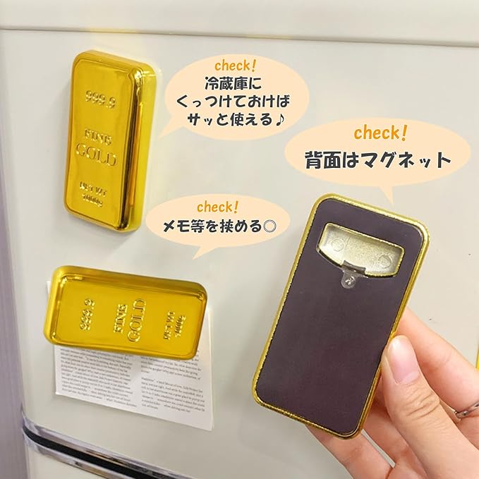 キラキラに輝く金の型の栓抜きです。ぱっと見は金塊の遊び心溢れるデザイン♪背面はマグネットなので冷蔵庫などにくっつける事が可能です。