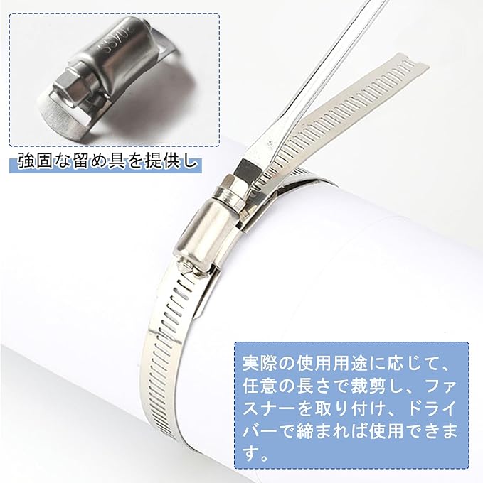 【長さ調整可能】長さを調整可能なホースバンドとファスナーセットを提供しています。必要な長さに切り取って、スクリューダーで締めるだけで簡単に使用できます。