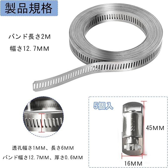【製品仕様】パッケージ内容:304ステンレスバンド長さ2M、留め具5個付きます。バンドの幅さ:12.7mm、バンドの厚み 0.6mm;留め具のサイズ:16 45mm。