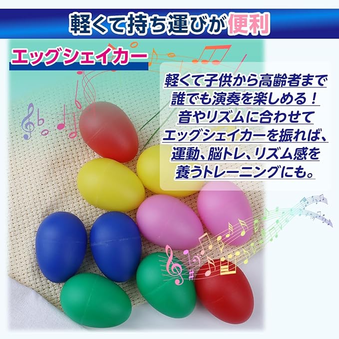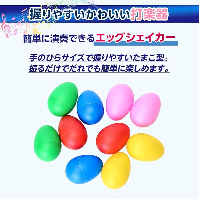 このエッグシェーカーは、イベントやパーティー、ライブの盛り上げ役としても大活躍します。カラフルな色合いと心地よい音色で、みんなを笑顔にし、楽しい雰囲気を一層高めます。軽量設計のため、老人ホームや福祉施設での運動や脳トレなどのトレーニングにもおすすめで、参加者全員で振りながら一体感を楽しめるアイテムです。幅広い年齢層が一緒に楽しめるため、どんな場面でも活躍すること間違いなしです。