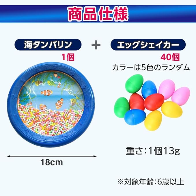 セット内容には40個のエッグシェーカーが含まれ、5色のカラバリで見た目も楽しめます。学校の音楽レッスンやDIYペイントにも使え、イースターや誕生日パーティーの装飾等、特別な思い出を作るアイテムとしてもご利用いただけます。 【セット内容】海タンバリン1個とエッグシェイカー40個(カラーは5色のランダム) 【商品仕様】海タンバリン:直径約18㎝、エッグシェイカー:重さ1個13g ※対象年齢:6歳以上