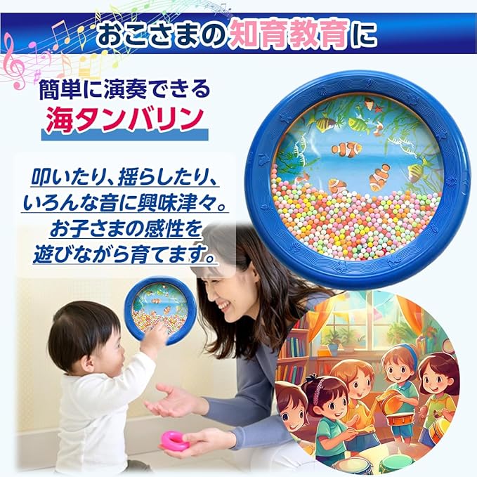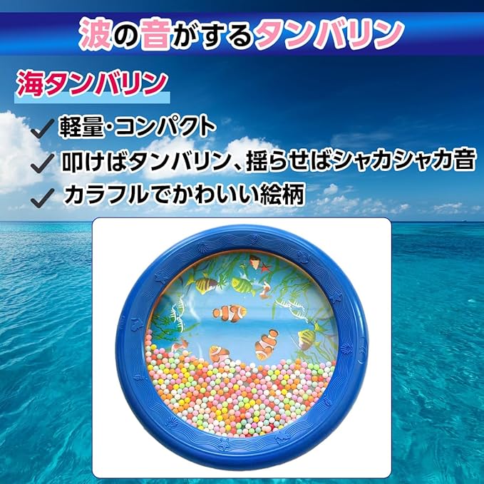 海タンバリンは、子供から大人まで楽しめるユニークなパーカッション楽器です。軽く揺らすと内蔵されたビーズがシャカシャカと音を奏で、叩けばタンバリンとして様々な音を奏でる楽器として使用可能。カラフルな絵柄と水中の魚のデザインが子供たちの興味を引き、音楽的な感性やリズム感を育む知育玩具としてもおすすめです。また、子供用楽器として、誕生日やクリスマスのギフトとしても最適です。