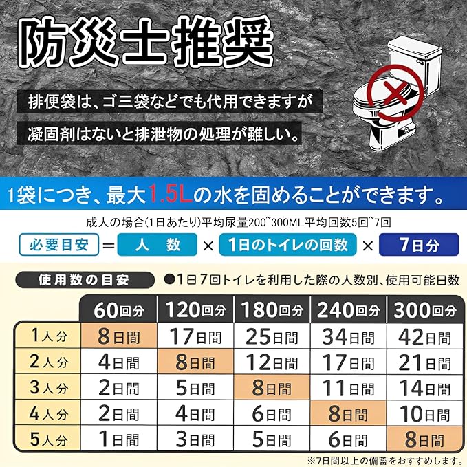 【なぜ凝固剤だけの購入は必要なの?】日本は災害大国であり、自然災害や突発的な出来事が頻繁に起こります。 処理袋は緊急時にはゴミ袋で代用できますが、排泄物は凝固剤がないと処理できません!また、凝固剤はアウトドアハイキング、介護、嘔吐物、厨房や工業廃油の排水処理にも使用でき、用途は非常に広い!