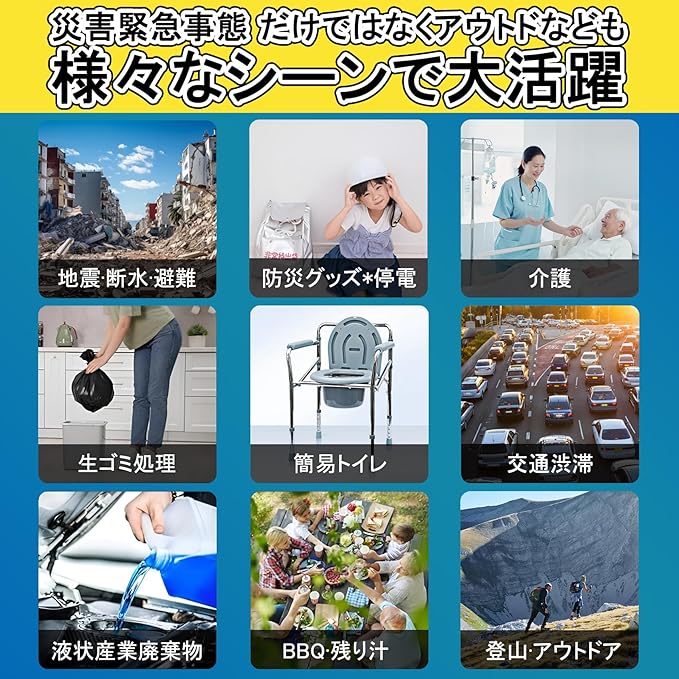【使いやすい個包装&軽量】日本は災害大国であり、自然災害や突発的な出来事が頻繁に起こります。 処理袋は緊急時にはゴミ袋で代用できますが、排泄物は凝固剤がないと処理できません!また、凝固剤はアウトドアハイキング、介護、嘔吐物、厨房や工業廃油の排水処理にも使用でき、用途は非常に広い!