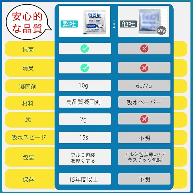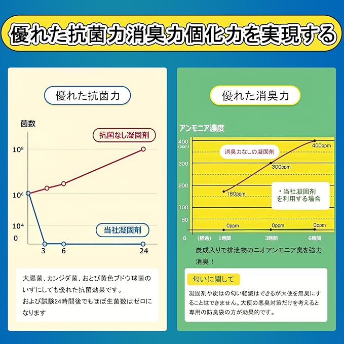 【凝固剤重量の向上と包装内容の改善】市販の6g、7gの凝固剤に比べ、10gに増量し、吸水綿シートや一般的な凝固剤に比べ、吸水速度や凝固効果が向上しました。 なお、ここでいう凝固効果とはゼリー状の効果である。吸水容量は1000㏄位で大便は一回使い切り、小便は2回くらい利用できる。乾燥してる大便を固める場合は100㏄の水を加えると効果はよくなります。