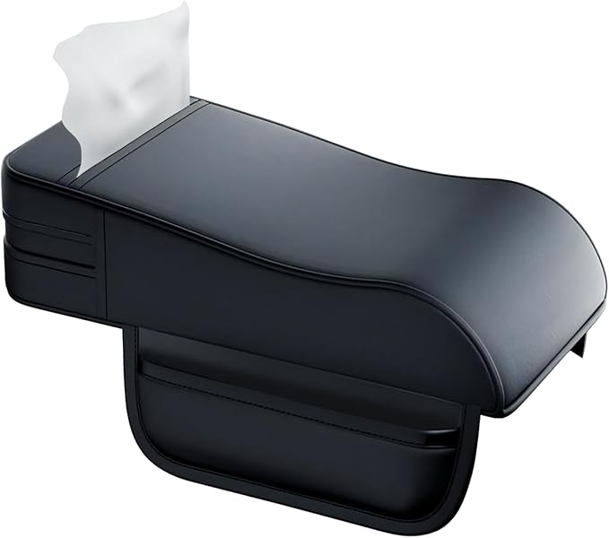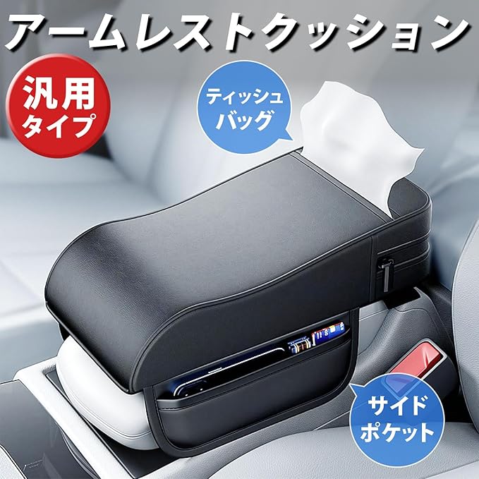 【便利なティッシュバッグ付き】このアームレストクッションは、ティッシュを本体内部に収納できる便利なバッグ付きです。内蔵されたティッシュバッグ(幅15.5cm、奥行き10cm、高さ8cm)はティッシュの位置ずれを防ぎ、子供やペットがいる環境でもストレスなく使用できます。また、コンソールボックスに設置することで、運転席、助手席、後部座席どこからでも簡単にアクセスできるのもグッド。