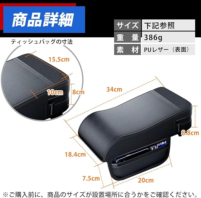 【商品仕様】材質:PUレザー 本体長さ:約34cm 幅:約18.4cm 高さ:約8.8cm ティッシュバッグ幅:約15.5cm 奥行き:約10cm 高さ:約8cm 【主な対応車種】ヴェゼル、ヤリスクロス(2024 マイナーチェンジ)、キックス、カローラクロスをはじめとした様々な車種に対応 ※汎用品なので、設置を検討されている箇所の幅と本製品の幅のサイズをご確認いただいた上でご購入いただきますようお願いいたします。