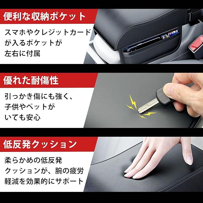 【高品質素材と洗練デザイン】通気性に優れたPUレザーを使用し、心地よい肌触りを実現。耐摩耗性と耐傷性に優れているため爪の引っかき傷などにも強く、お子様がいる家庭でも安心して使用できます。ブラックレザーの高級感あふれる外観は車内の雰囲気をスタイリッシュにし、ドライビングの楽しさが視覚的にもアップ。実用性と美しさを兼ね備えた、汎用タイプのアームレストカバーです。