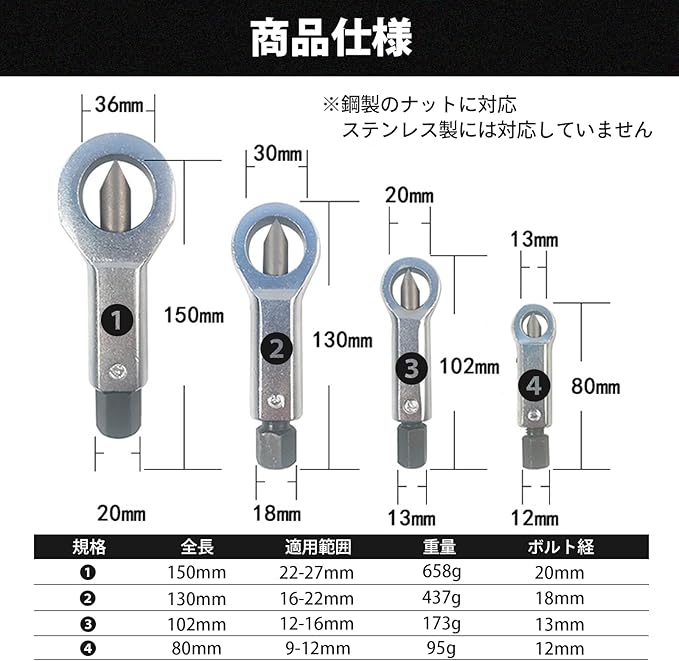 ✅【商品詳細】ナットブレーカー。サビや角がナメて動かないナットを割って外すことができます。サビや角がナメてどうやっても動かないナットを割りにご使用いただけます。ナットの径 9-12mm、12-16mm、16-22mm、22-27mm 4種類をご用意しました。ナットサイズに適用した工具をお選びください