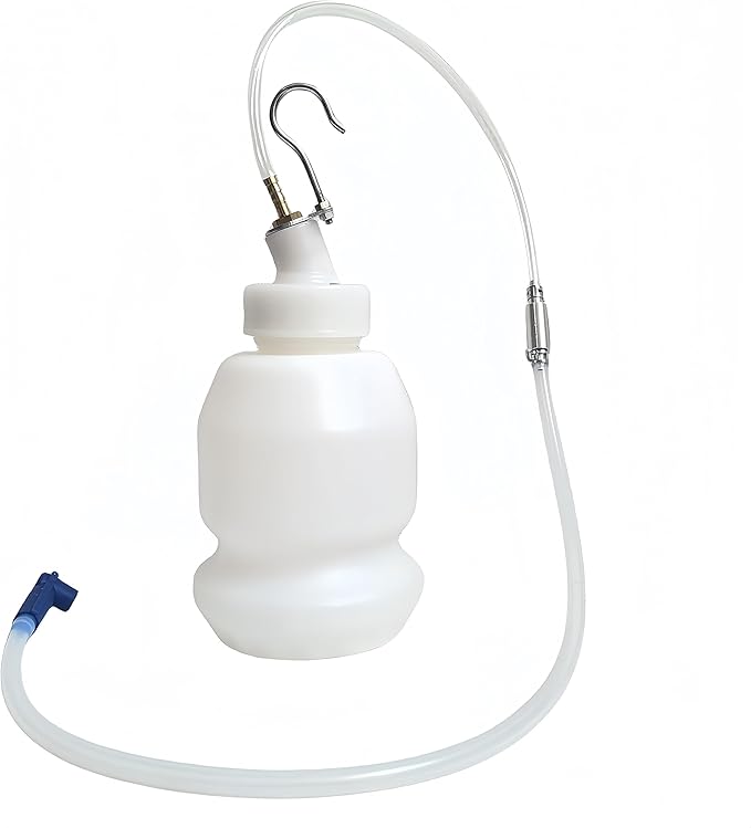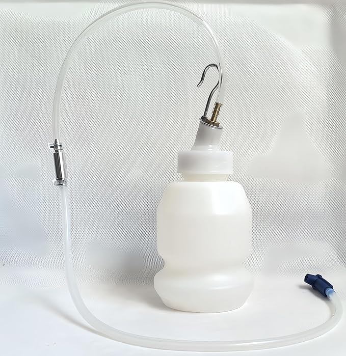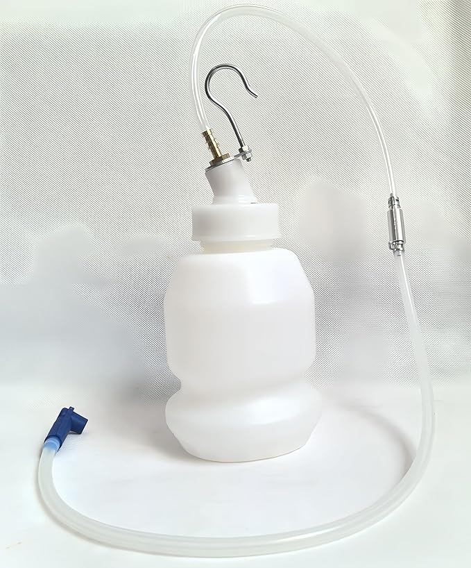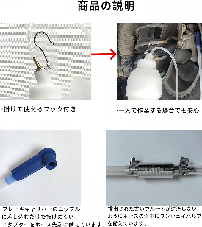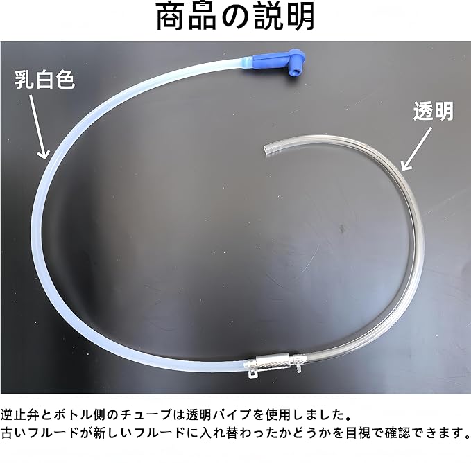 ワンウェイバルブ付き:排出された古いフルードが逆流しないようにホースの途中にワンウェイバルブを備えています。