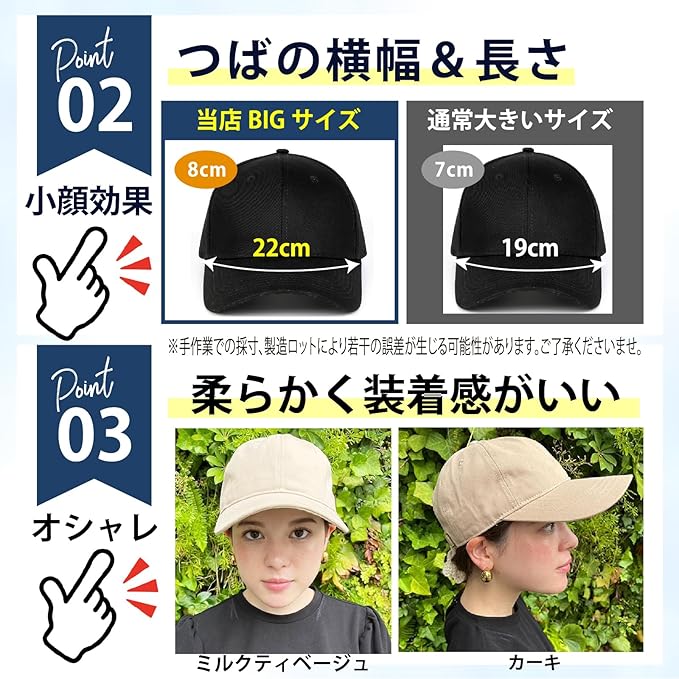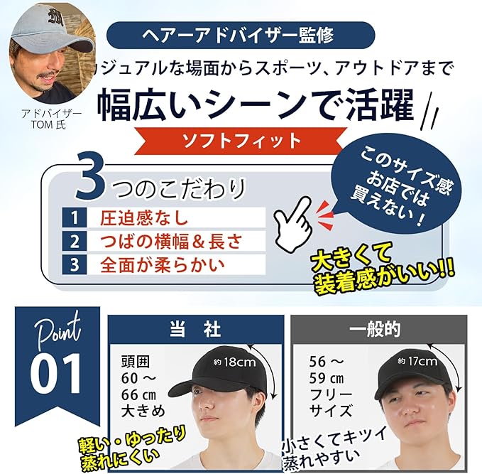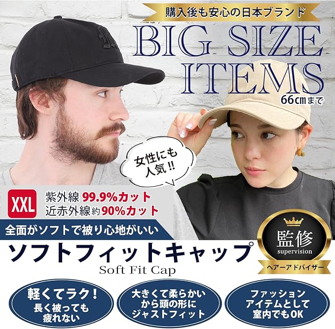 特大サイズ(60-66cm)と柔らかクラウンでさらにかぶりやすい。