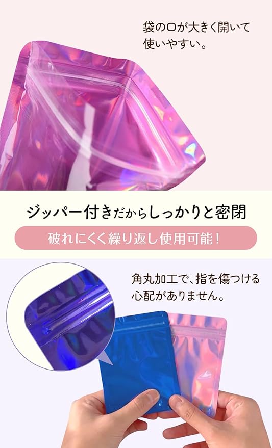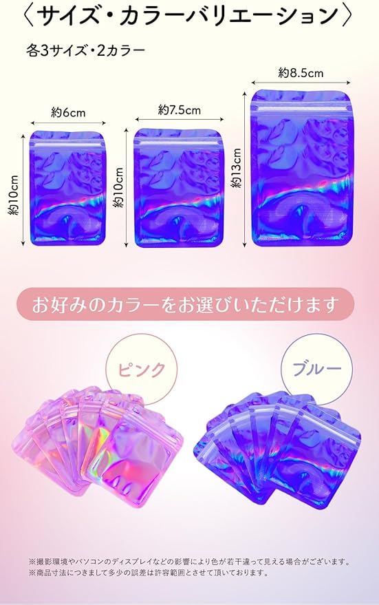 【おしゃれなチャック袋】目を引くブルーとピンクのオーロラカラーが特徴のこのチャック袋は、収納するだけでなく、お部屋のデコレーションとしてもぴったりです。コンパクトサイズで、小物の整理が簡単に、そしておしゃれに行えます。厚手で丈夫な作りなので、繰り返し使っても耐久性に優れています。